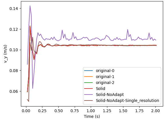 在下图中,我模拟了几个case。纵坐标是轴向观测点Velocity[15][1]的数据,横坐标是物理时间。original-0、original-1、original-2表示用原始程序跑三次出的结果(每次跑结果都不一样,跑三次可以看出大致趋势);Solid是将线弹性材料改为Solid并不传递任何参数的结果。Solid-NoAdapt在Solid基础上进一步取消了Adaptation。Solid-NoAdapt_Single_resoltion在Solid-NoAdapt的基础上将流体粒子的间距减小为shell粒子的间距,这样就是单一分辨率了。