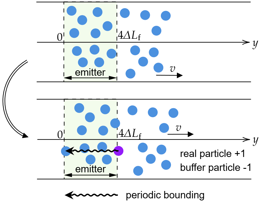 看下面这张图。假设上方是初始粒子分布。注意这里有个容易误解的地方:图上显示的所有粒子,包括emitter区域的粒子,都是real particle。不要误认为emitter区域的是buffer particle。如前所述,buffer particle的属性是没有意义的,只是起到预留内存空间的作用。根据案例设定,emitter右边界在4ΔLf的位置。当时间向前推进,粒子向右移动,程序检测到有一个粒子越出了emitter的右边界,这时,会依次执行: