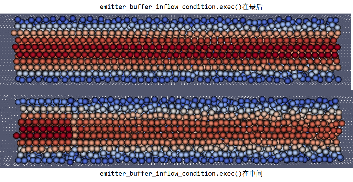 对比一下可视化的结果(颜色表示轴向速度)。当我们把emitter_buffer_inflow_condition.exec();调到中间的位置,内部流体的速度与入口出现了较大差异,而且粒子分布变得更乱了。