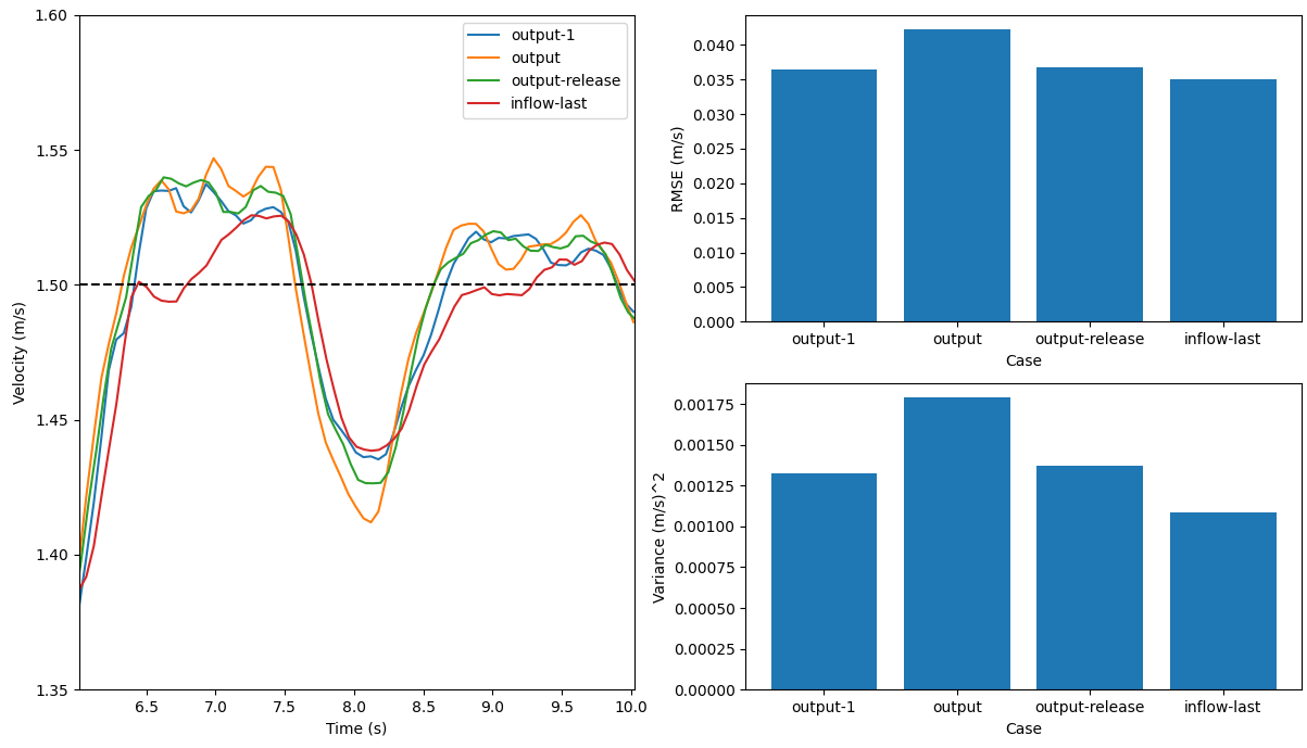 第二次试验,我把槽道流案例的parabolic_inflow.exec();调到了内循环的最后。下图中,名字中有output的案例都是原始代码跑出的结果(微小差异,看平均值)。inflow-last是把parabolic_inflow.exec();调到内循环最后的结果。左图是是轴线上某一点的速度对比,$u_y=1.5$的水平线表示预期收敛到的速度。不难发现,把入口速度条件调到最后,好像更接近目标速度了,而且波动也更小了。右上图中把案例的结果速度与目标速度进行了对比,inflow-last的RMSE最小;右下图计算了每个案例的速度方差,inflow-last的方差也是最小。